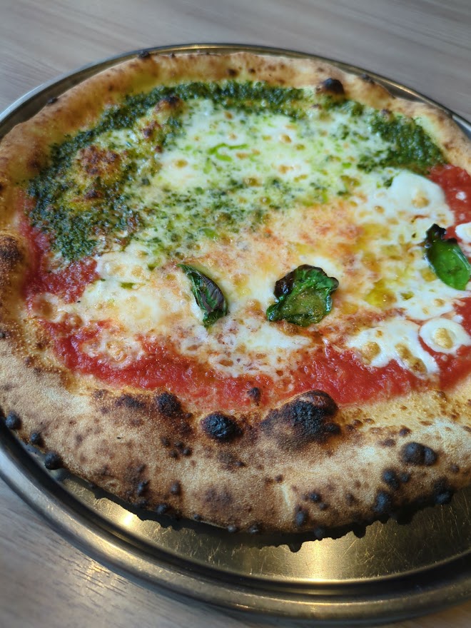 真のナポリピッツァ協会認定店であるピッタゼロゼロへ。ピザのランチで、マルゲリータとジェノバのハーフ。思っていたよりかなり大きなピザ。Lサイズって感じかな。1人前とは思えないサイズ。