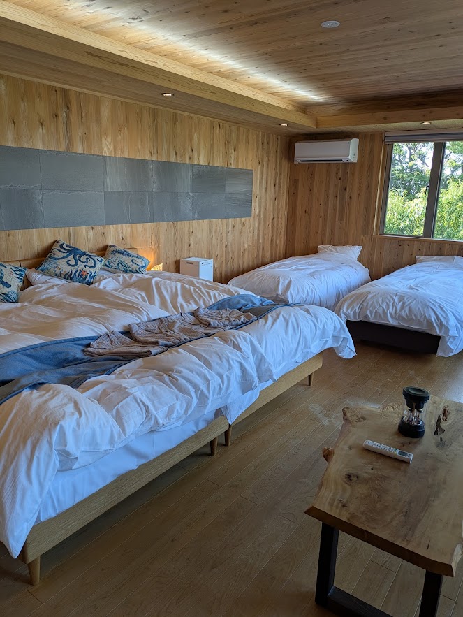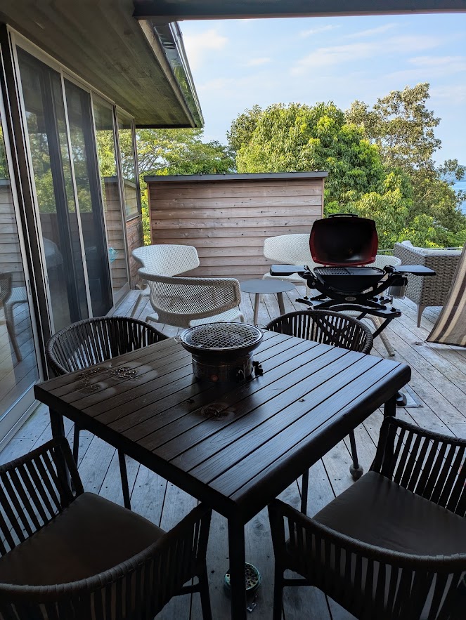 温泉露天風呂にサウナもついて、お部屋も素敵。バーベキューもできるとのことでここに。