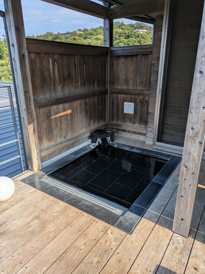 露天風呂。一応壁があるけど、正面は海に向かっているので、お風呂入るときに着れるゆあみ着もあり。夏は水着で過ごすのがおすすめ。