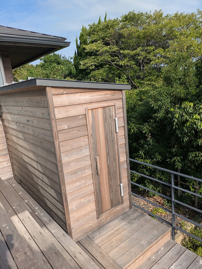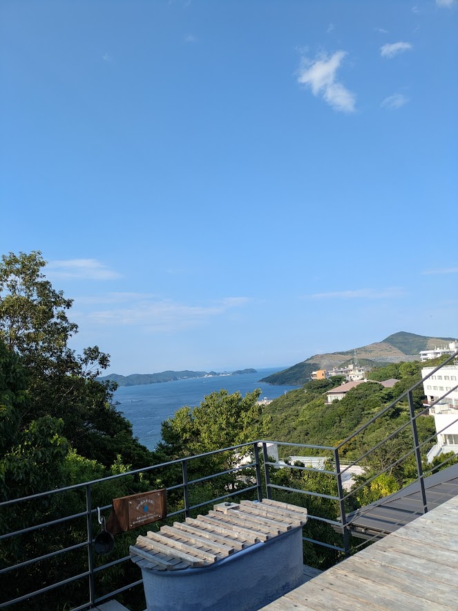 高台にあって海も見える。ちなみに写真に写っているのはサウナ用の水風呂。