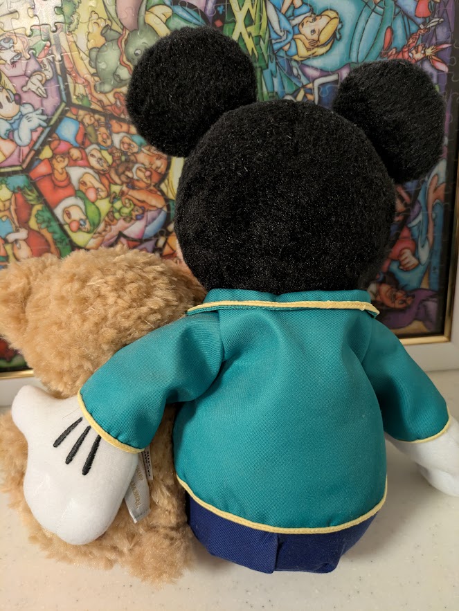 両手にダッフィーみたいな。今回購入したダッフィーは左を向いて固定されているのでミッキーの右側に置くといいんだけど、右のダッフィーとミッキーはつながってるので無理で。