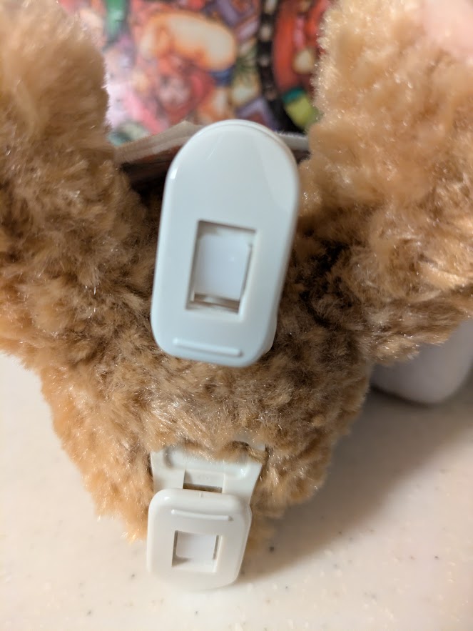 おしりにクリップがついていて、公式の写真では、肩にちょこんと座ってこっち見てる状態になっていてかわいい。今まで寝そべった状態のものは色々なキャラが出ていてそれもかわいかったけど、座るなんてすごい!肩に乗せたいわーって思って買ったけど・・。