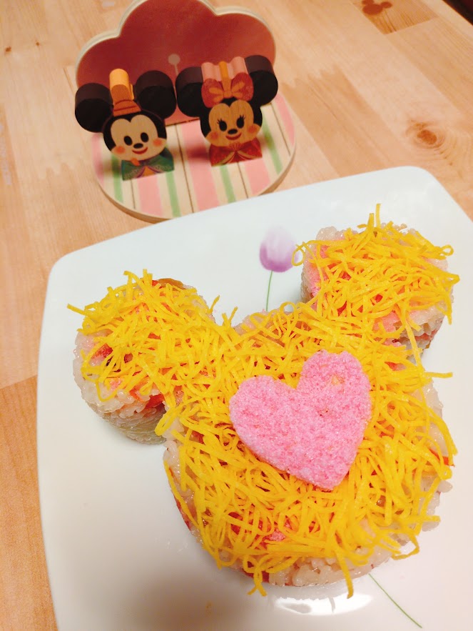 3人で一緒に作って、ひな祭りといえばこのミッキーちらし寿司みたいになっていて何より。