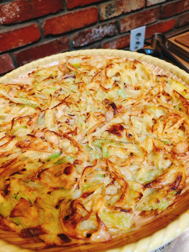 海鮮チヂミ。21000ウォン。チヂミって油多めのイメージだったけど、これはそこまでではなくおいしかった。