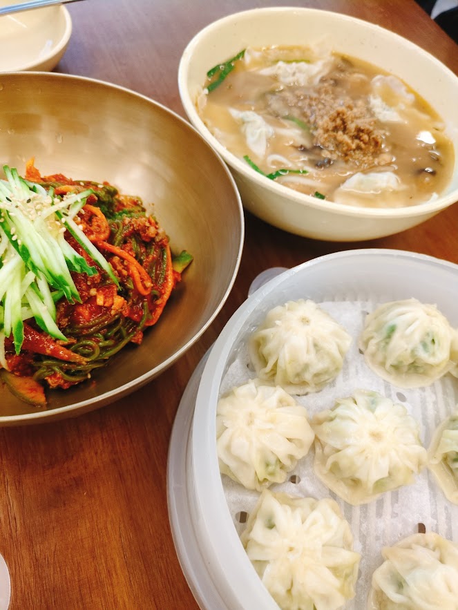 昔行った時も食べた明洞餃子13000ウォン。見た目は小籠包みたいだけど蒸し餃子。メニューは3品だけど、こちらも1人1品注文のため、餃子をもう一つで4品。辛いビビン麺12000ウォンはおいしかったけど、サービスのキムチは辛すぎて食べれなかった。温かい麺のカルグクス12000ウォンは優しい味。