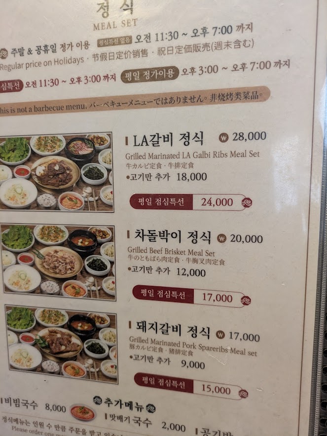 メニューだと一番下。平日ランチ15000ウォン、ディナー17000ウォン、お肉の追加9000ウォン。この日は休日で残念・・。